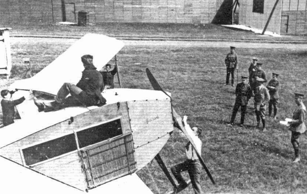 Parke made a circuit of the sheds in order to get into position for landing in a good place up wind, and proceeded to alight in the usual way without the least mishap. Thus did he and his observer (who, having no belt and rather cramped accommodation, was thrown up against the front wall of the cabin) escape at the last moment from what looked like certain death. Indeed, they effected a perfect landing with the machine none the worse for its severe straining, save a slight stretching of some of the lift-wires under the main planes.