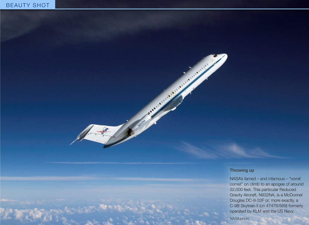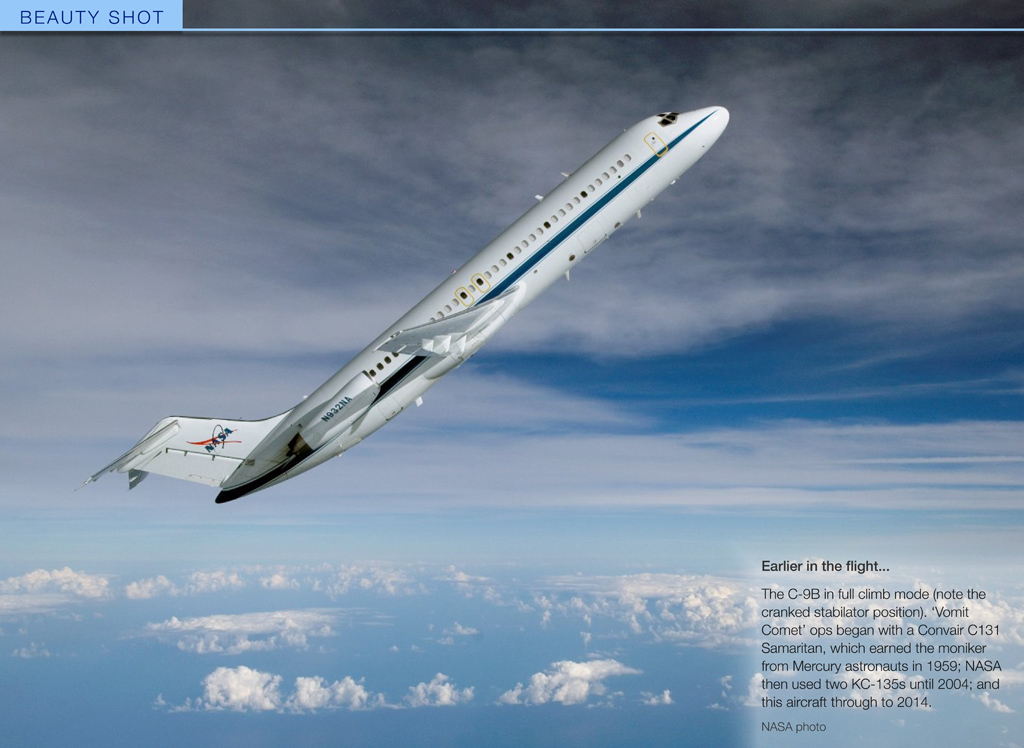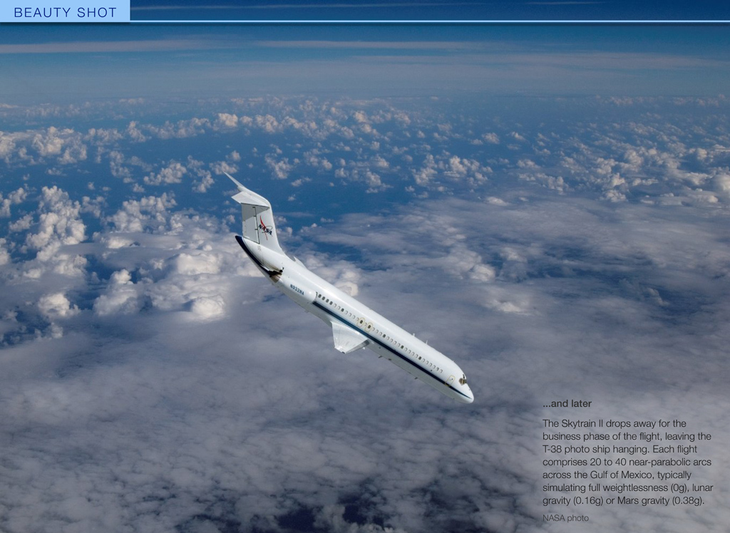 While shots of grinning TV presenters experiencing weightlessness aboard ‘Vomit Comet’ flights are a dime a dozen these days, images of aircraft actually flying the mission are harder to find. So here are some shots of the last NASA Reduced Gravity aircraft from an accompanying T-38.