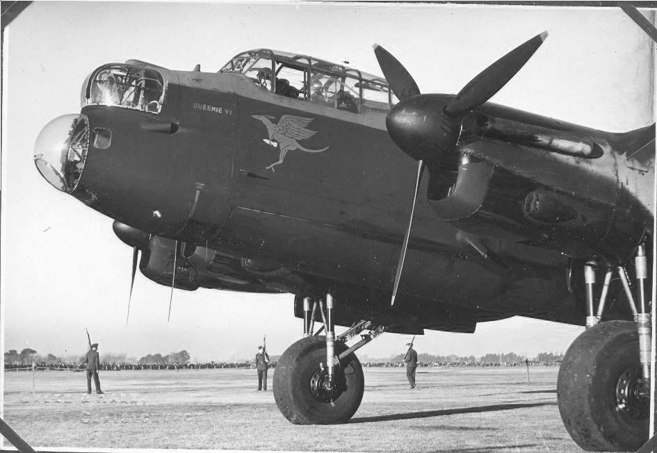 The best documented and arguably most famous, though, was the flight of Avro Lancaster Mk.I ’Queenie VI’. The big four-engined bomber, RAF serial ED930 and RAAF serial A66-1, had been flown from the UK to Australia to support the Fourth Liberty Loan. She left Prestwick, Scotland on May 22nd, 1943 and, after 74 hours’ flying time via Montreal – Toronto – San Francisco – Honolulu – Palmyra, Is. – Canton Is. – Fiji, she arrived at Amberley, Queensland on June 3rd. She spent most of June touring New Zealand to raise funds for the Liberty Loan there, before returning to Australia.