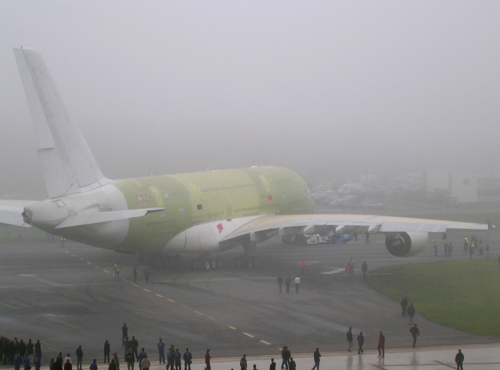 The first Airbus A380 F-WWOW (cn 001) finally rolls out of production (albeit with only two engines) on December 10th, 2004. (Photo by Mathieu Thouvenin | Flickr CC BY-NC-ND 2.0)
