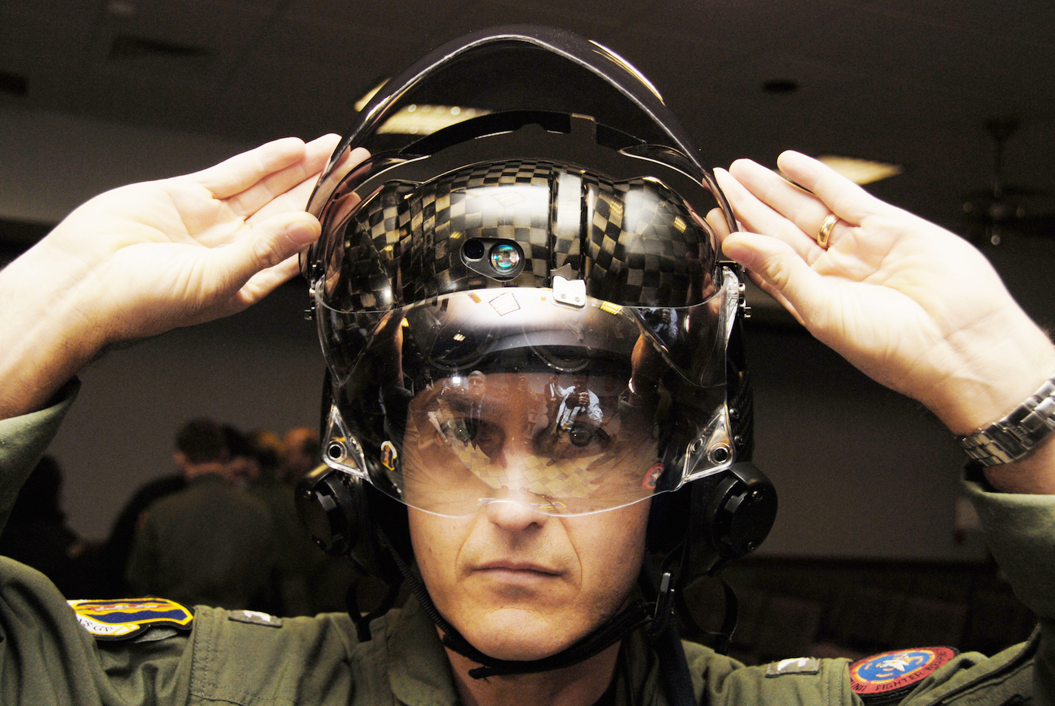 US Navy Capt. Mike Saunders tries on a new F-35 helmet – part of the wider JSF system – on Feb. 25th, 2010. (U.S. Air Force photo/Airman 1st Class Anthony Jennings)