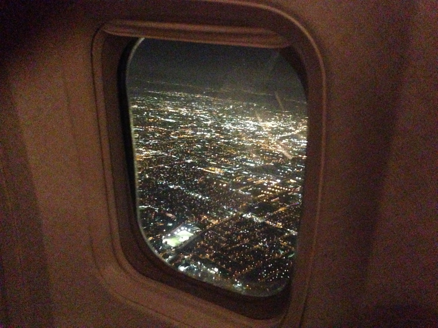 Los Angeles glitters beyond the cabin window, during a night approach to LAX. (Courtesy of Mark Vanhoenacker)