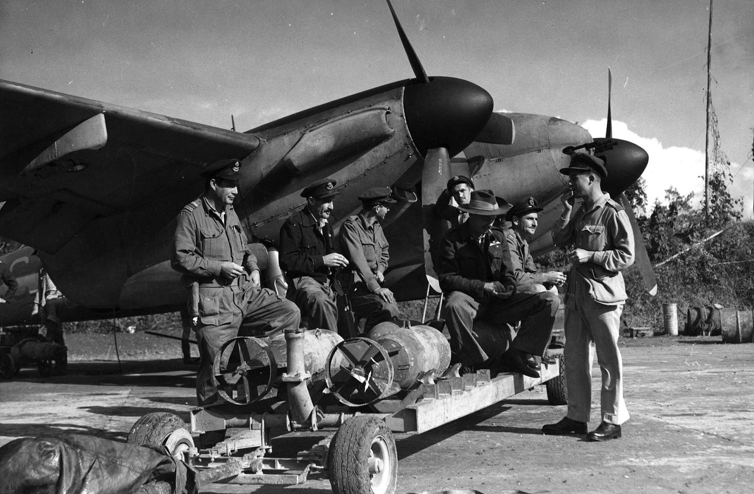 A RAAF crew load up their Mosquito FB (most likely a locally built Mk.40) in Burma. Note the under-wing hard points of the Fighter Bomber variants. (State Library of Victoria H98.100/1583)