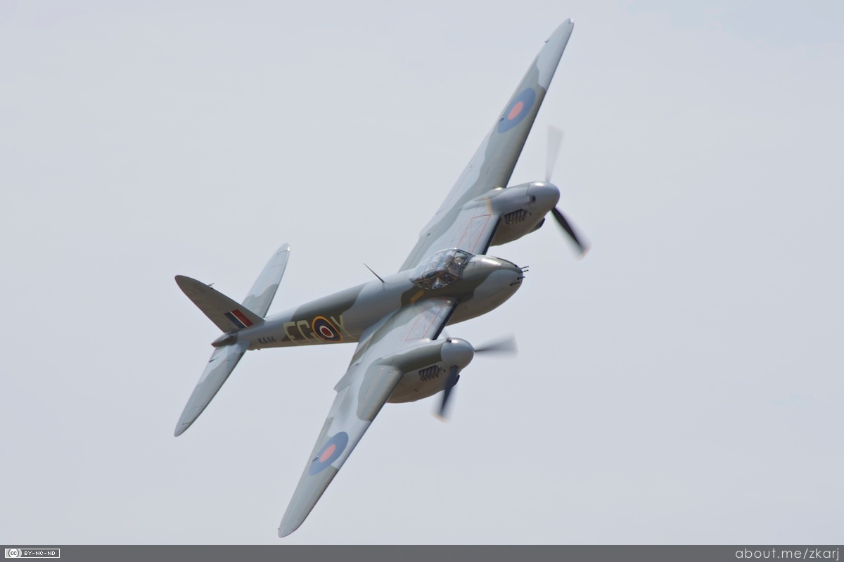 KA114 comes around during the 2013 WIngs over Wairarapa show. The DH98 was especially agile at altitude. Once, in a fight at 40,000 feet, a pursuing Me109 once stalled and fell more than 10,000 feet while trying to turn inside a high flying Mosquito, (Courtesy of Allister Jenks)