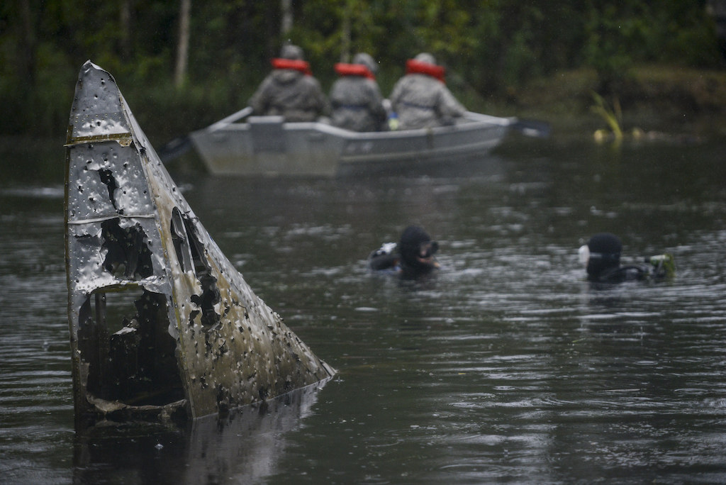 Divers from a joint Eielson AFB and Fort Wainwright team work back toward the tail fin of #214 on August 1st, 2014. Note the summer weather! (USAF photo, Snr Airman Peter Reft)