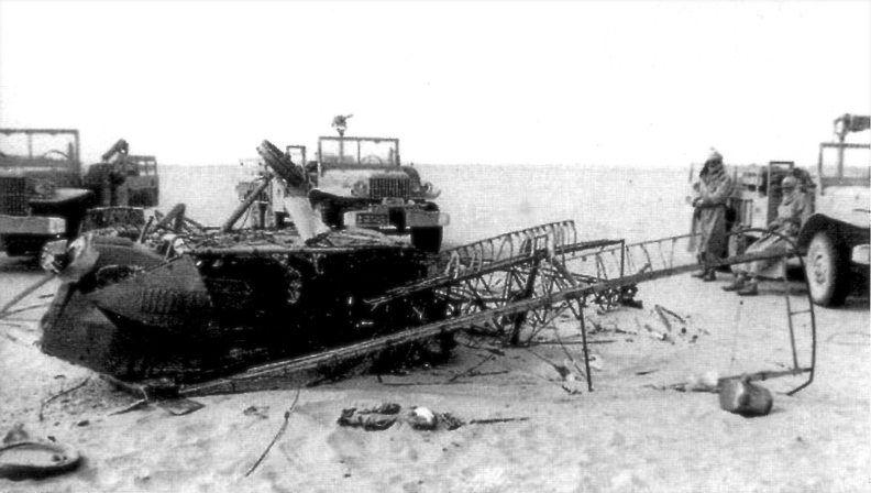 The 1962 French Army patrol and the wreckage of Southern Cross Minor. Lancaster’s mummified remains lie partly buried in the foreground. (© Soldat Humbert)