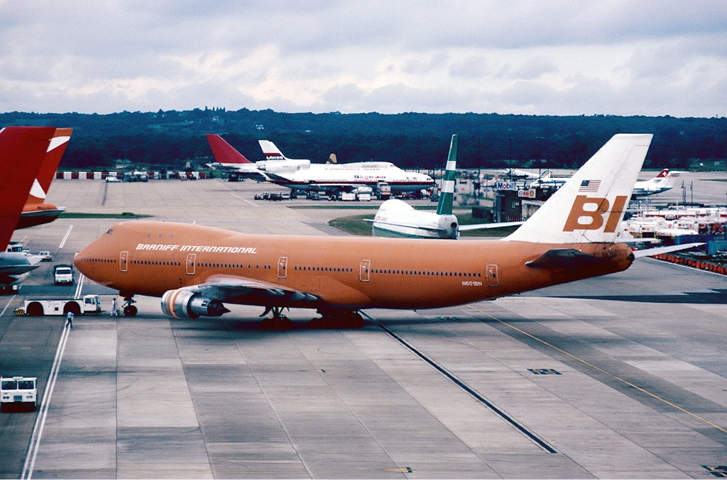 The Big Orange… Braniff’s 747-127 N601BN being pushed back at Heathrow in Sept 1981. This aircraft went to Polaris in June 1982, then LT Metro in March 1983 and Tower Air in December 1983. Its career ended in March 1993 and it was parted out. (Tim Rees | wikipedia GNU 1.2)