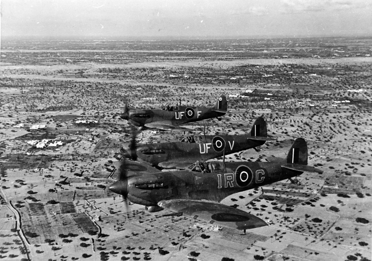 Three Spitfire LF Mk.Vb Trop over North Africa. The lead aircraft IR-G is piloted by Wing Commander Ian Richard "Widge" Gleed, 244 Wing. He was shot down and killed in the Cap Bon area of Tunisia on April 16th, 1943. (LoC P&P fsa.8e00953)