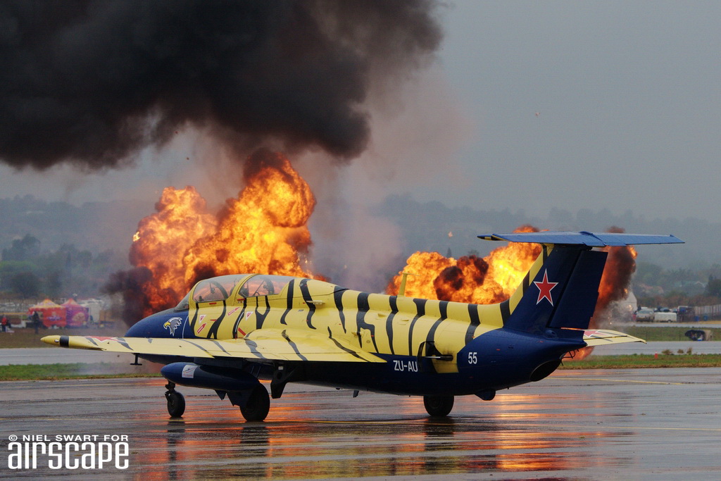 ZU-AUX, an Aero Vodochody L-29 ‘Delphin’ jet trainer of the SASOL Flying Tigers display team, (msn 591707), pits its stripes against the AAD2016 pyrotechnics. (© Niel Swart)