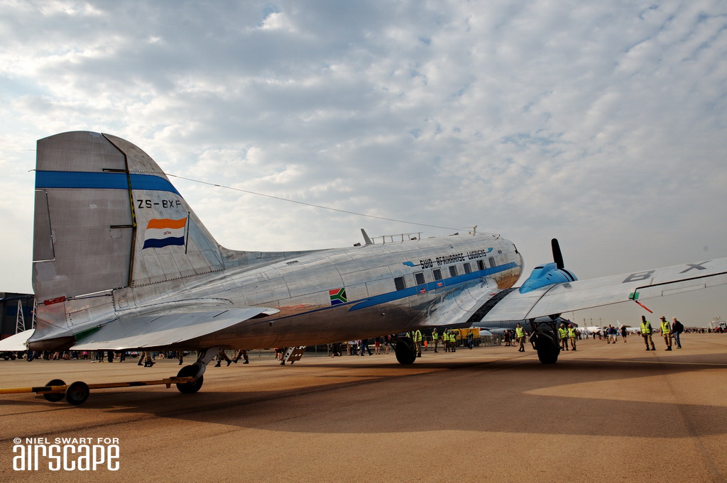 A classic angle on a classic aircraft – the tail-feathers of the South African Airways Museum Society’s DC-3 ‘Klapperkop’ , serial ZS-BXF. (© Niel Swart)
