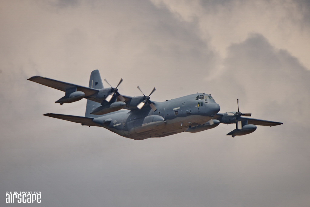 The USAF’s combat search and rescue specialist, HC-130N (#88—2101), makes a fast pass in front of the threatening skies. (© Niel Swart)
