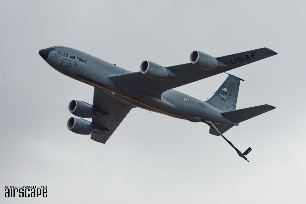Proving that 50 isn’t too old for a Boeing jet, KC-135R #63-7985 roars past with its refuelling boom extended. ©Niel Swart)
