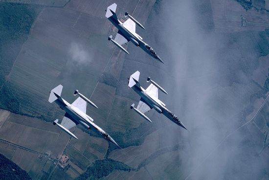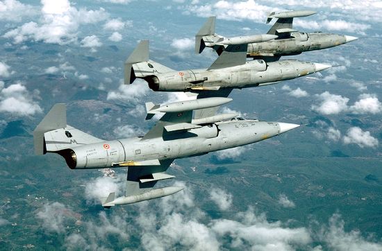 Three Italian F-104S Starfighters, stooging along high over their native countryside. (SDASM #00045358)