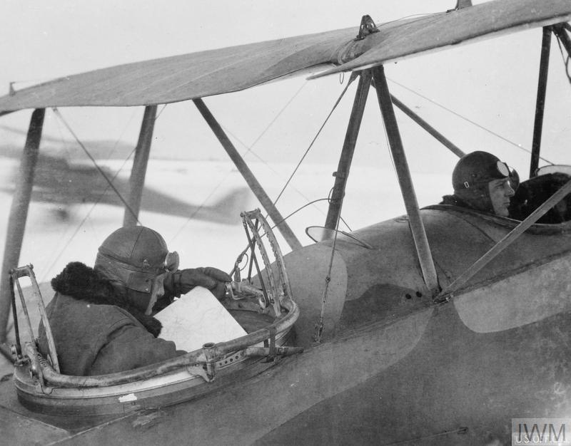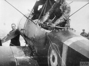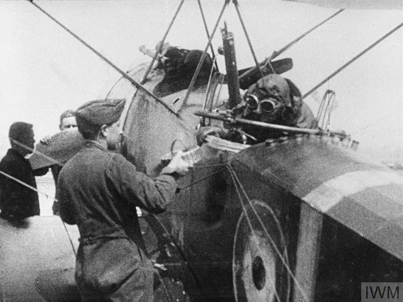 Ground crew pass Lewis gun magazines to the observer as the pilot settles into his cockpit. You can imagine how hard it would be for either to see, move and fight. (IWM Q 65428)