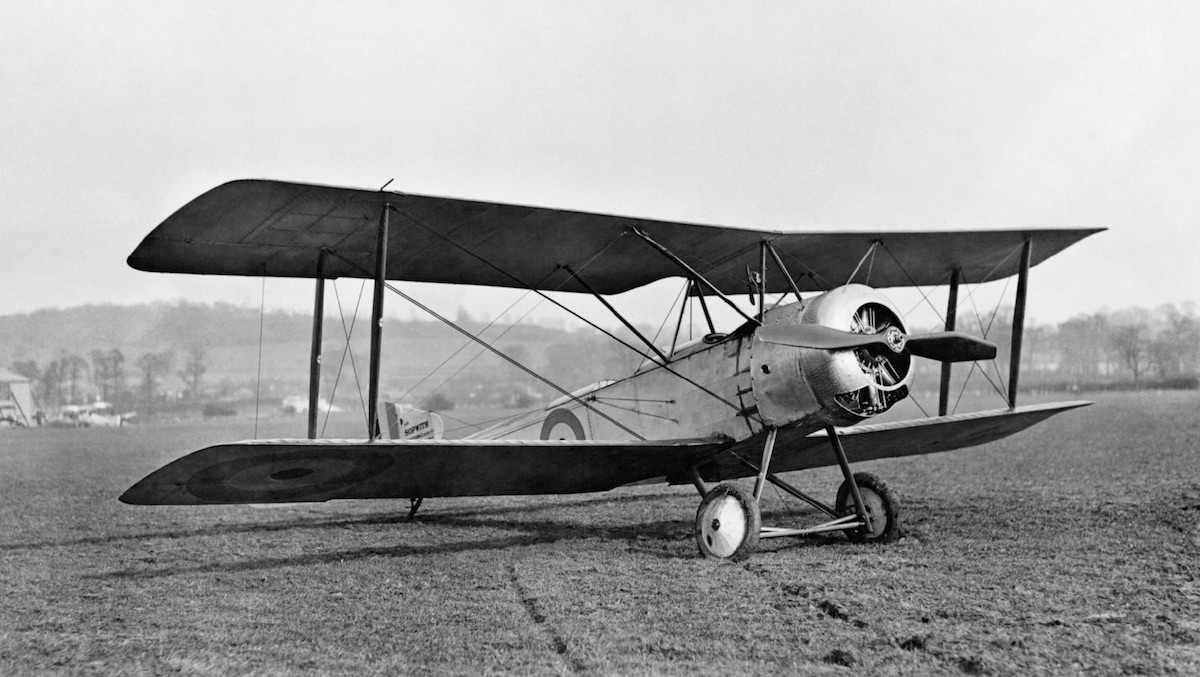 A pilot and observer prepare their Sopwith 1½ Strutter for a patrol, as a mechanic stands by to swing the prop. Note the pilot’s Aldis sight in this 1917 image. (IWM Q 65428)
