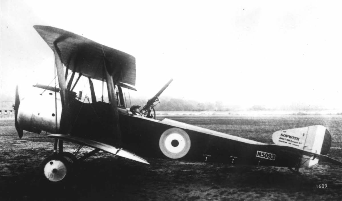 A study of Admiralty Strutter N5093 at Brooklands, October 1916, set up by Sopwiths to show the defensive coverage of the rear gun. (Courtesy of kingstonaviation.org)