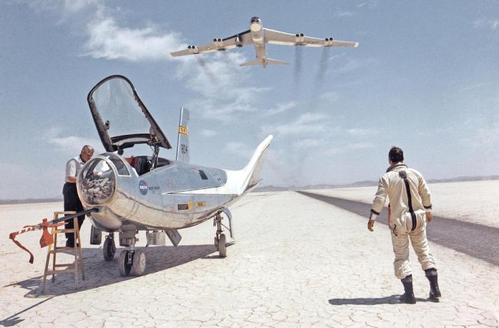 Bill Dana watches the NASA NB-52B mothership pass overhead the HL-10. Note the launch pylon on the B-52’s right wing. NASA inspector John Reeves is working on the HL-10’s cockpit. (NASA photo)