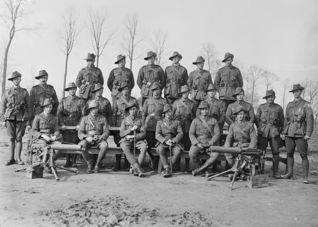 Men of the 24th Machine Gun Company in 1918, wiht two of their Vickers guns. Cedric Popkin is second from the right, in the middle row. (AWM E01716)