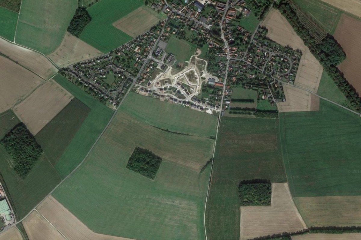 The same area today, Bertangles village at the top. The 1918 photo was taken from above the wood on the left, looking right, so the buildings were beside the square wood in the centre, with flying from the large field below it. (Map data © 2018 Google)