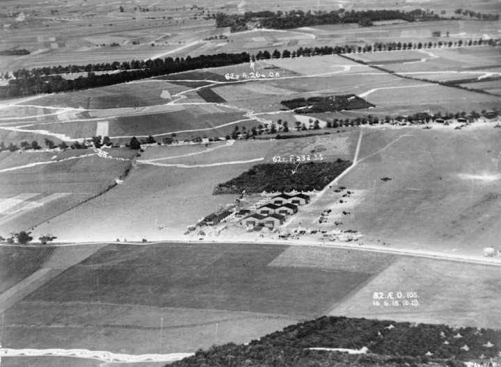 A wonderful view of No.209 RAF and No.3 AFC’s shared airfield just southwest of Bertangles village, looking east, in June 1918. (IWM Q 55522)