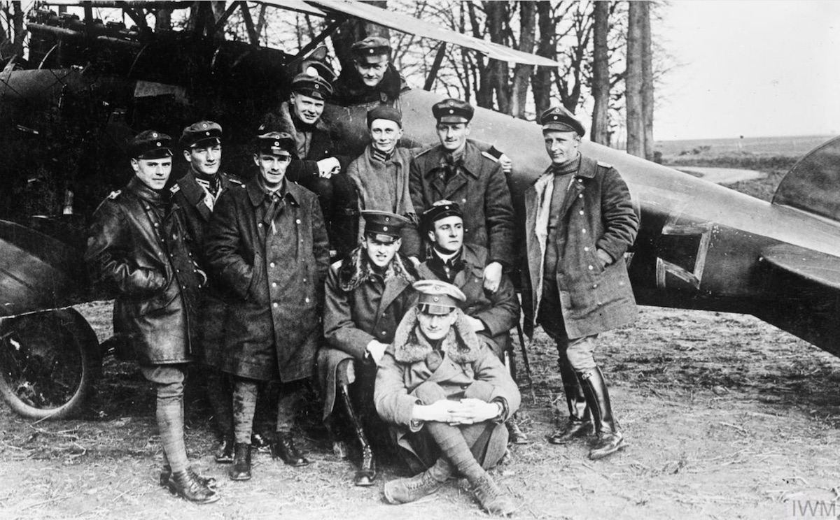JG 1 pilots visit a still-bandaged Manfred von Richthofen in hospital at Courtrai, following his wounding in action on July 6th, 1917. (IWM Q 52781)