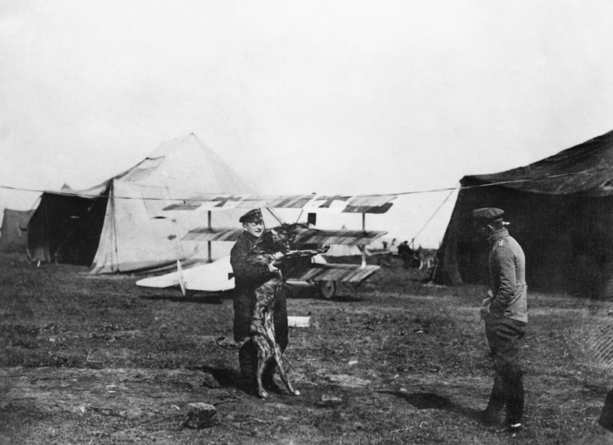 von Richthofen frolics with his beloved Danish hound, Moritz; possibly Lothar’s triplane behind. After Manfred pranked his fellow pilots while waiting for haze to clear on April 21st, they tied a chock to Moritz, who ran to his master for solace. (IWM Q 63137)