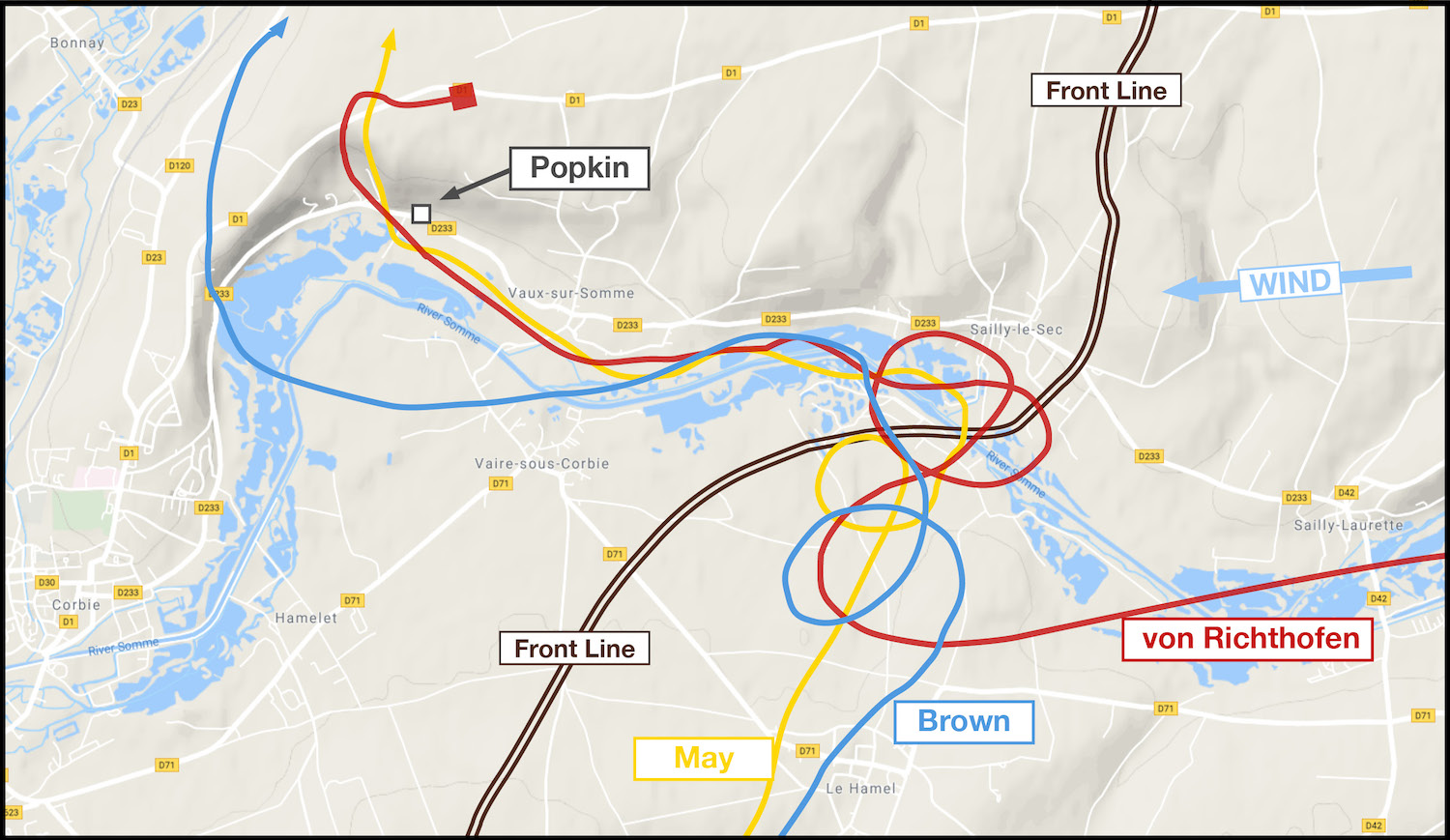 1. I’m very confident this was the actual course of events too. However, when I was prepping that battle map it struck me that the tracks are only an approximation based on highly stressed recollections, analysis and extrapolation. It’s not like the aircraft had GPS units or Flight Data Recorders on board – and one only has to nudge con Richthofen’s line ever so slightly to make it impossible for Popkin to have made the shot too.
