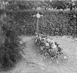 The Red Baron’s original grave in Bertangles village cemetery. His remains were disinterred several times over the years and now lie in a family plot in Wiesbaden. (IWM Q 8149)
