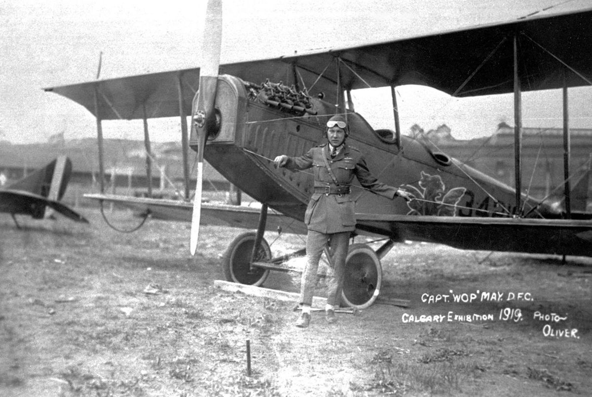 Capt. Wilfrid Reid May, pictured in full flying regalia with his Sopwith Camel, near the end of the War. (IWM via wikipedia)