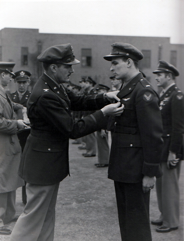 Sobanski receives an unspecified decoration from (then) Colonel Jesse Auton. Facing the camera at left is (then) Captain Duane Beeson, Commander of the 334th from 15 March to 5 April 1944. (IWM UPL13934 | CC BY-NC 3.0)