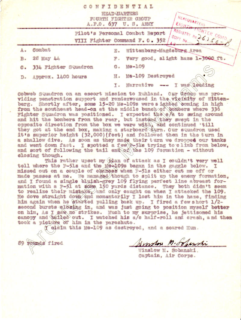 Still unblooded, Sobanski flew cover for Col. Blakeslee who was directing the battle. He never fired a shot, but received his Commander’s commendation for his self-discipline and for safely escorting Capt. James Clark home after that pilot’s P-47 had an aileron shot away.