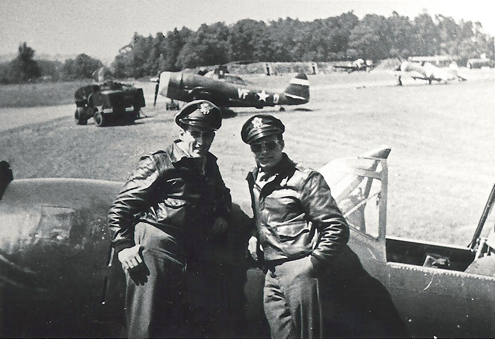 Captain Don Gentile and Lieutenant Spiros “Steve” Pisanos lean on the nose of a 4th Fighter Group P-47. Behind them is Sobanksi’s VF-O, #41-6183, ‘Mike II’. (IWM UPL24091 | CC BY-NC 3.0)