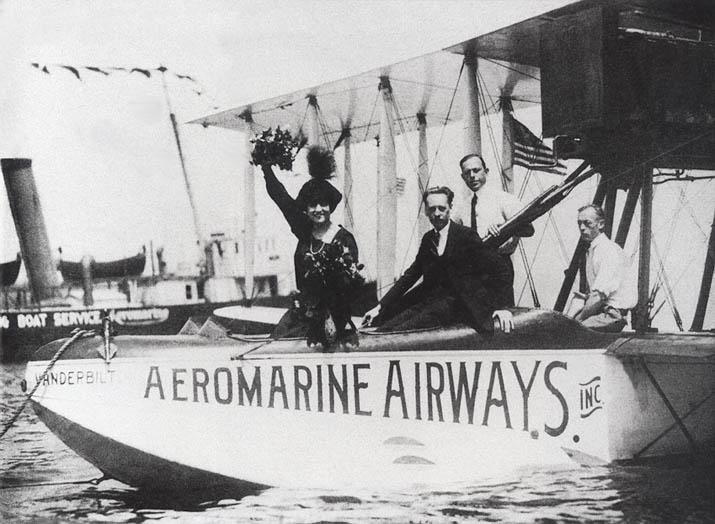 Harry Bruno (centre, dark suit) with opera star Marguerite Sylva and pioneer Pan Am pilot Edwin Musick (standing) aboard an Aeromarine Model 85 in 1922. (wikipedia)