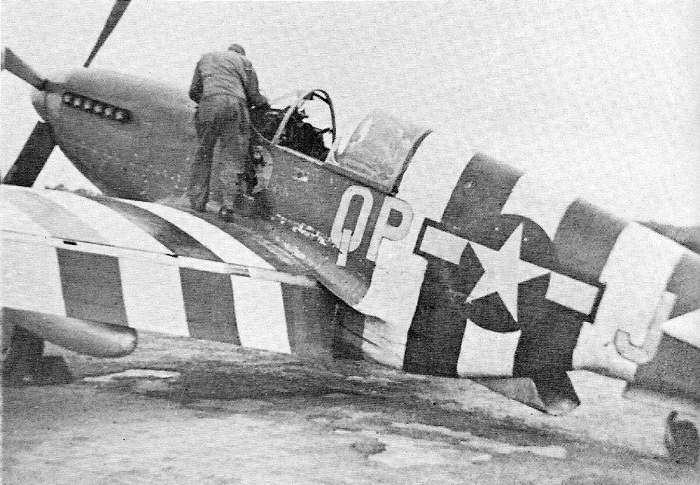 A hazy but important snapshot of P-51B QP-J, #43-6898 ‘The Deacon’ being serviced on June 6th, 1944. This can only have been taken shortly after Sobanski returned from the 334th’s pre-dawn mission at 0945, and before he took off for the last time at 1120. (IWM UPL14322 | CC BY-NC 3.0)