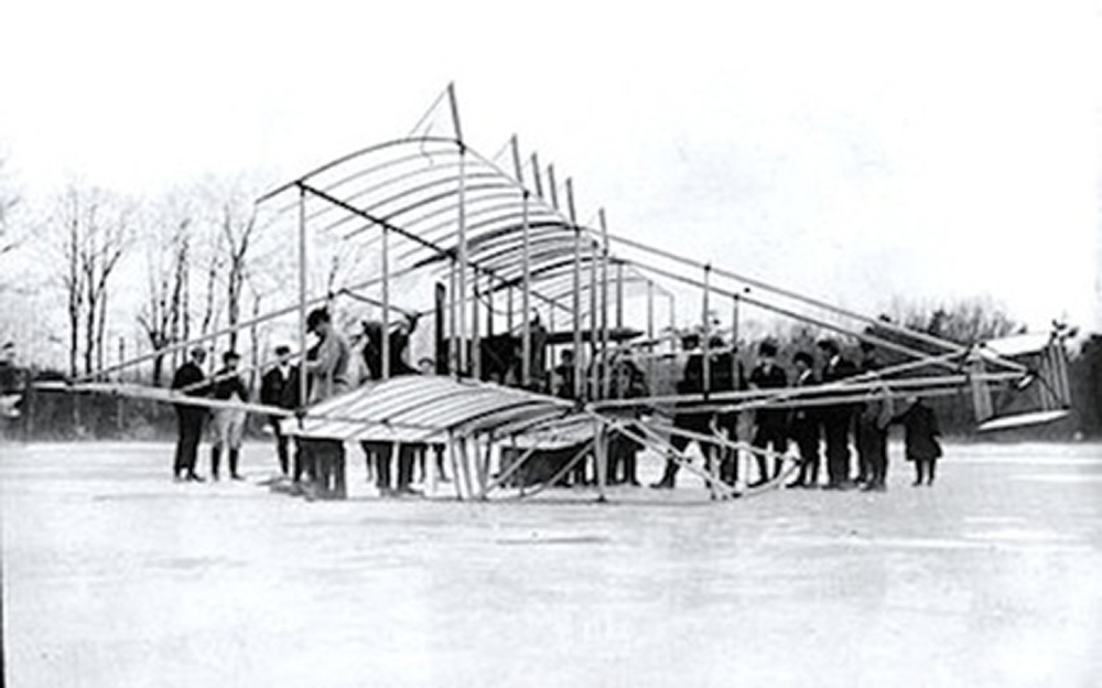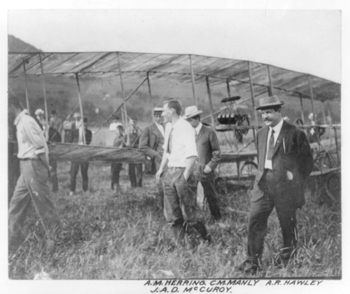 Glenn Curtiss’ June Bug after winning the Scientific American Trophy and $25,000 for the first US flight over one kilometre, on July 4th, 1908. Herring leans on the wing behind AEA engineer ‘Doug’ McCurdy (in shirtsleeves) and Langley’s engineer Charles Manley (in white hat). (LoC P&P cph.3a45230)