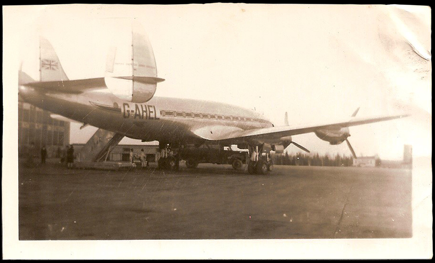 In the same spirit, Brian sent me this photo of the same L-049, G-AHEL, being refuelled at Gander some years later, from the town’s archives. The date is uncertain, but the aircraft is still in her natural metal and royal blue livery, which predates the white top scheme BOAC applied from about 1951. (Incidentally, the aircraft’s name was truncated to simply Bangor at the same time.)