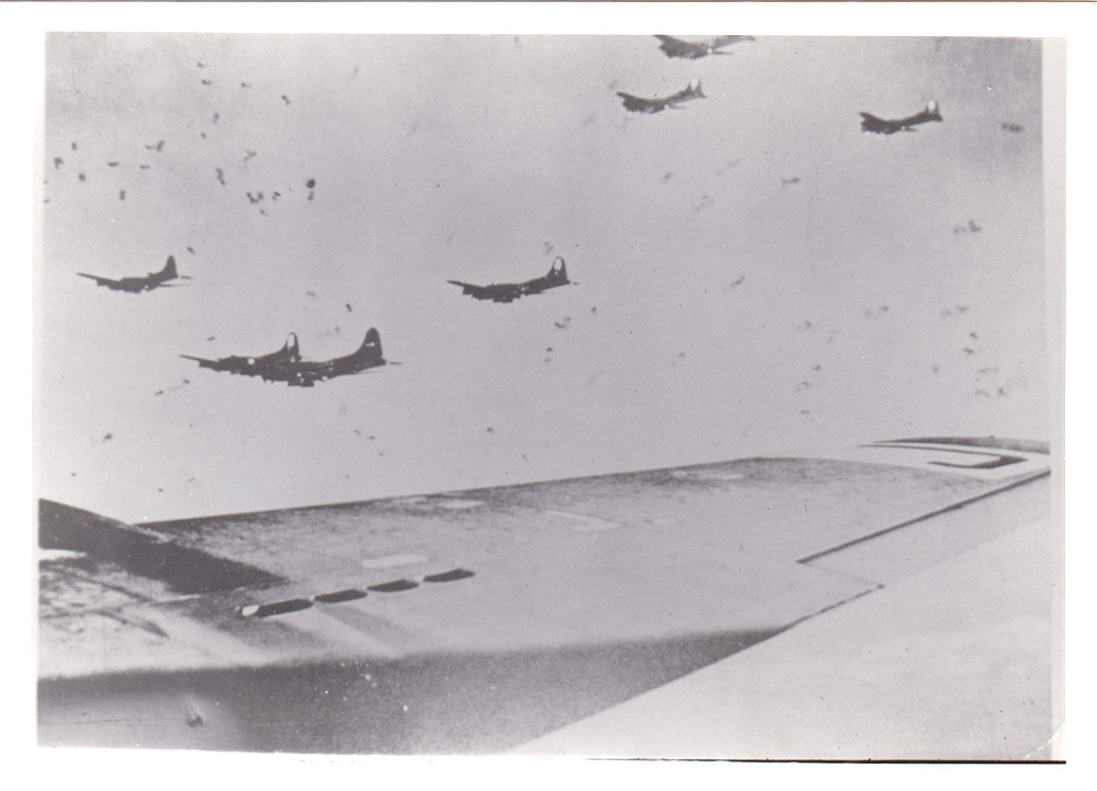 Where angels would fear to tread… Ships of the 525th Bomb Squadron (H) brave flak bursts on their way into a target. Date and location unknown. (IWM UPL 20136)