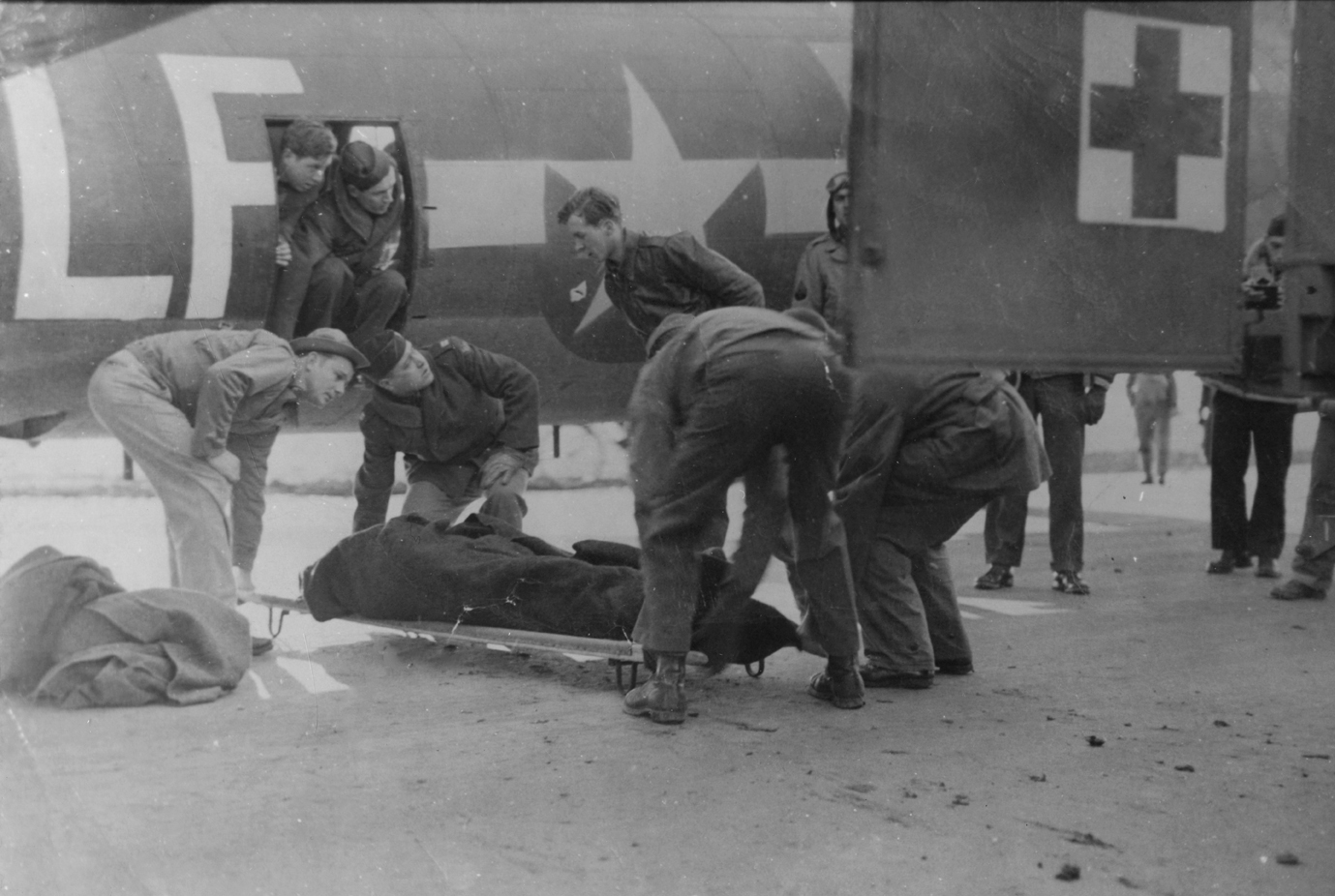 The grim reality… 525th staff trasnfer the body of Sgt. Noonan from his B-17 to an ambulance, after Noonan was killed by flak during a raid on Schweinfurt, February 24th, 1944. (IWM FRE 4752)