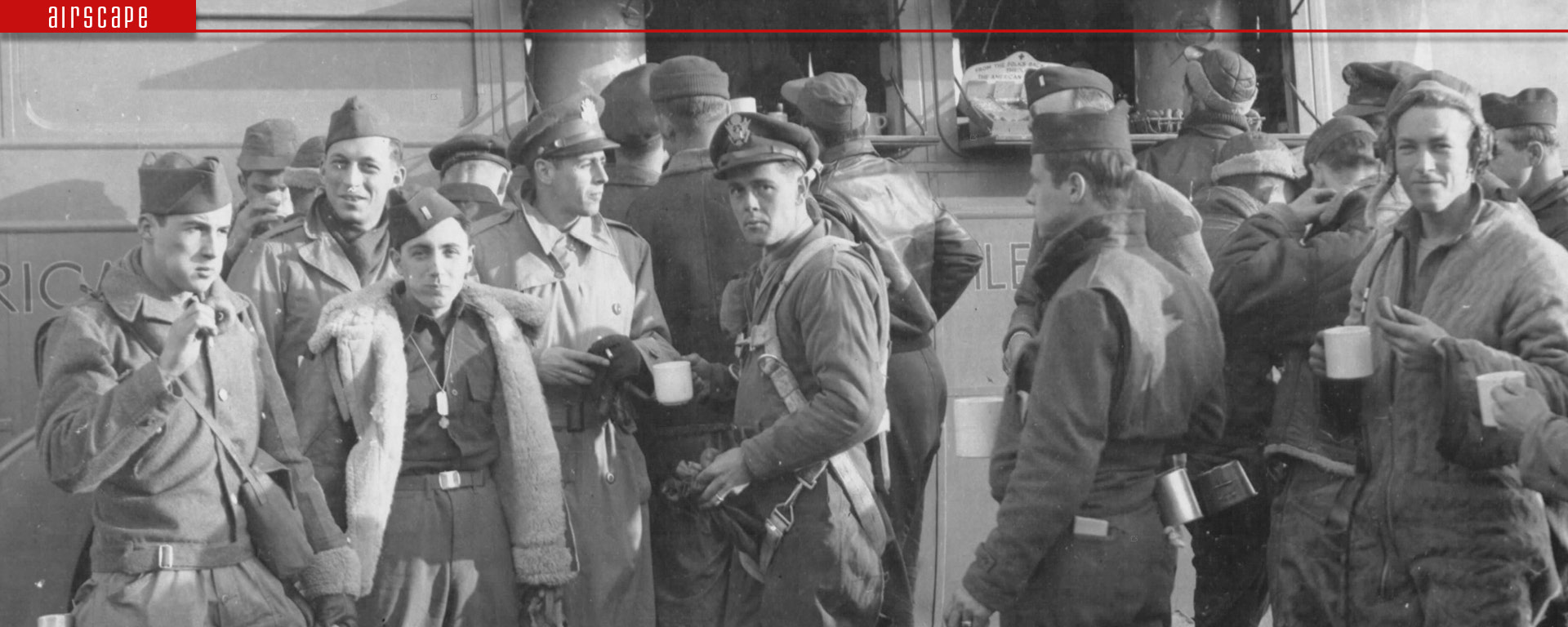 Aircrew from the 525th Bomb Squadron get coffee and donuts from a Red Cross van at Kimbolton, March 2nd, 1944. (IWM UPL36931)