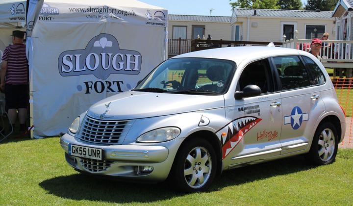 Next arrival is a Custom car. A silver Chrysler PT Cruiser that I chanced upon in a local car park a month ago. The second I saw it, I put a note on the car’s windscreen asking the owner to bring it to this event and to contact me. Thankfully he did both! He has driven it all the way from Dover, to honour 44-6133’s crew. This car, named Hell’s Belle, is truly unique. I have never seen one customised as the nose of a B-25 bomber before! Thank you so much for coming, Rob! It is a real eye-catcher!