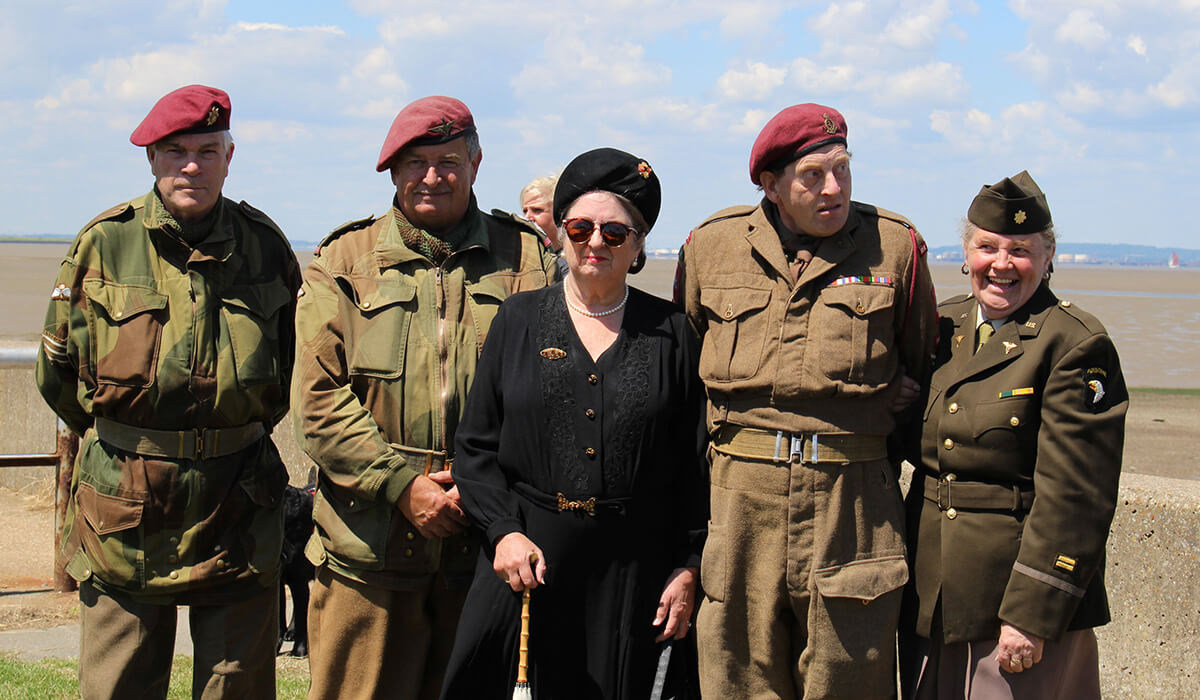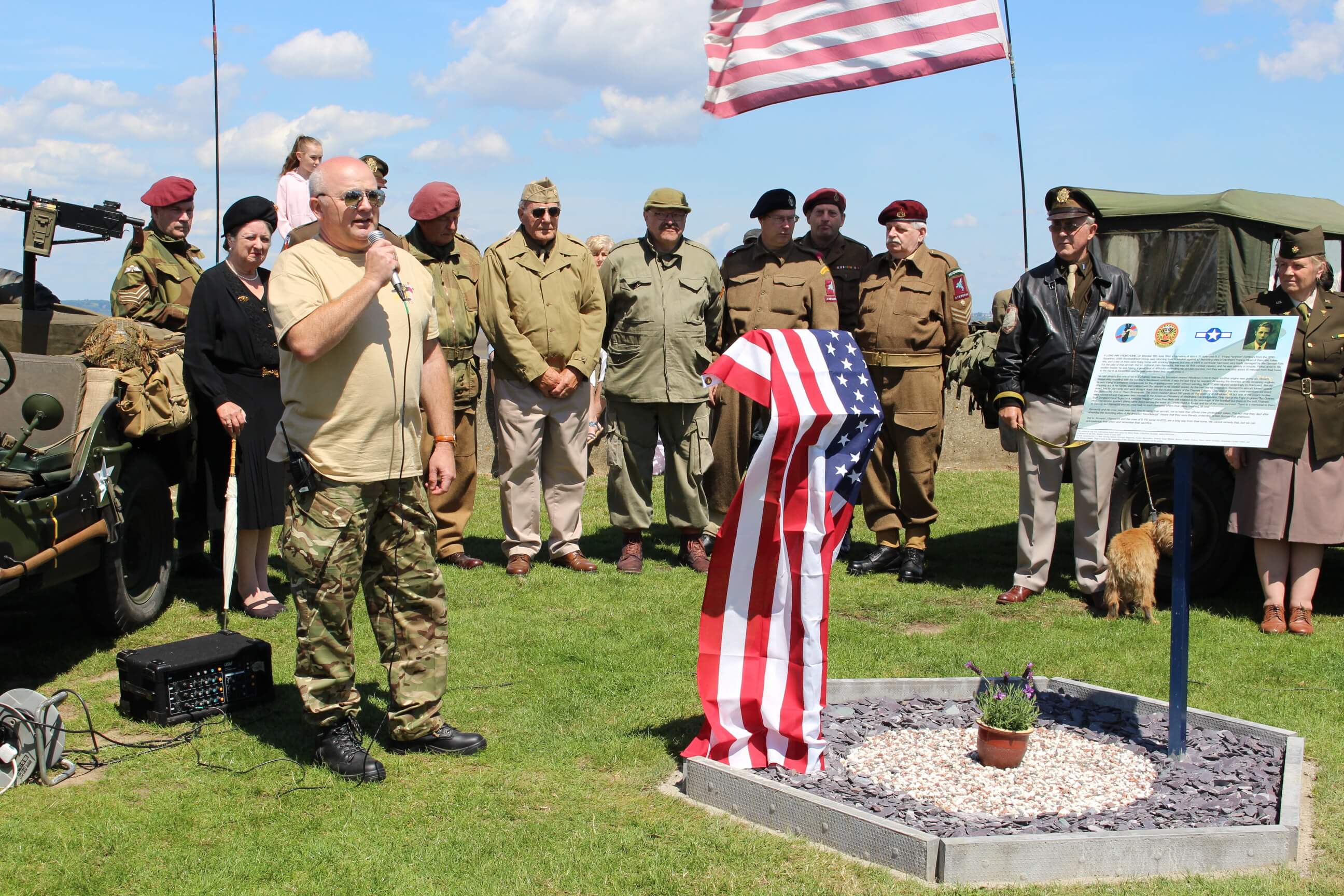 The first an open Jeep, the second, covered. Jezebel had actually seen combat service in Europe, having been built in 1944 and taken to France after D Day. Queenie a 1943 Jeep had been a general runaround vehicle, but she certainly looked the part! Both Jeeps were parked at an angle behind the memorial, Jezebel‘s period-correct and battle-torn US flag, fluttering proudly from her aerial in the background.