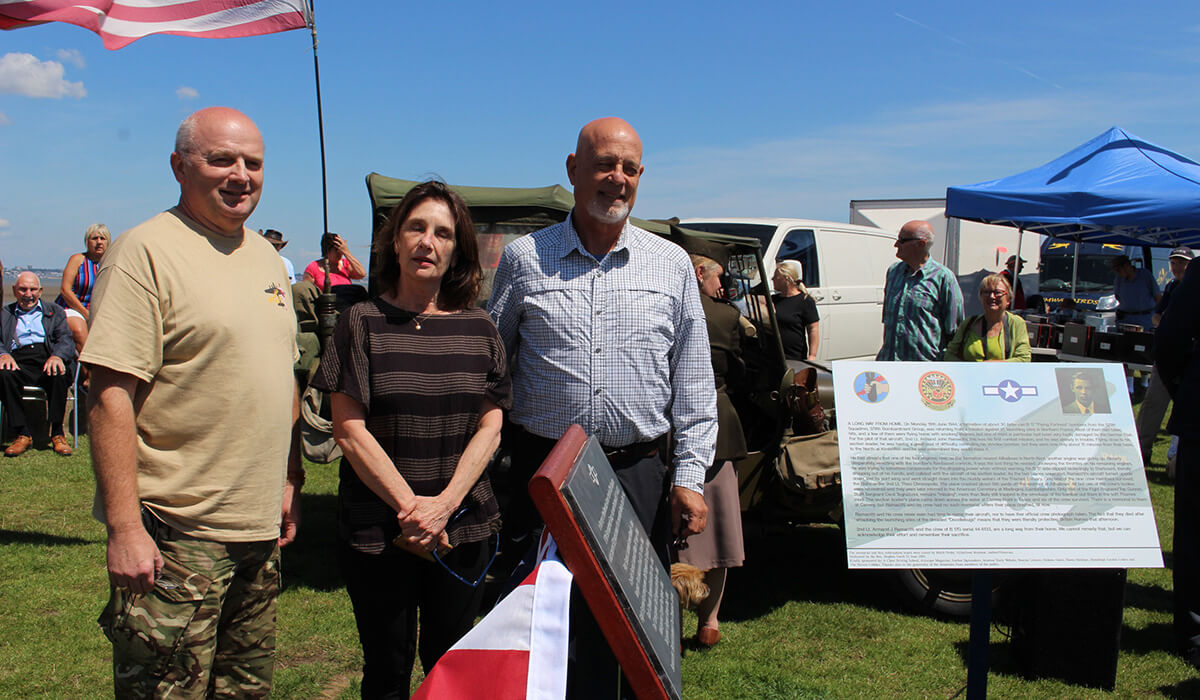 And speaking of Americans; where are my special guests?! The local Vicar has just arrived for a sort of dress rehearsal, but no sign of Noel Tognazzini and Jeanne Cronis-Campbell yet and it is gone 11:30! Getting concerned! Almost on cue, my walkie-talkie crackles into life. There is a crew relative looking for me. I look up to the ATC checkpoint and raise my hand high. Three minutes later, I am meeting Geoff Burke from Derby (he came with Jeanne) and being warmly embraced by Jeanne, who has come all the way from California to be with us as we honour her late Father, “Teddy” Chronopolis: 44-6133’s Bombardier and the only one of the crew to get out of that plane alive. But where is Noel?