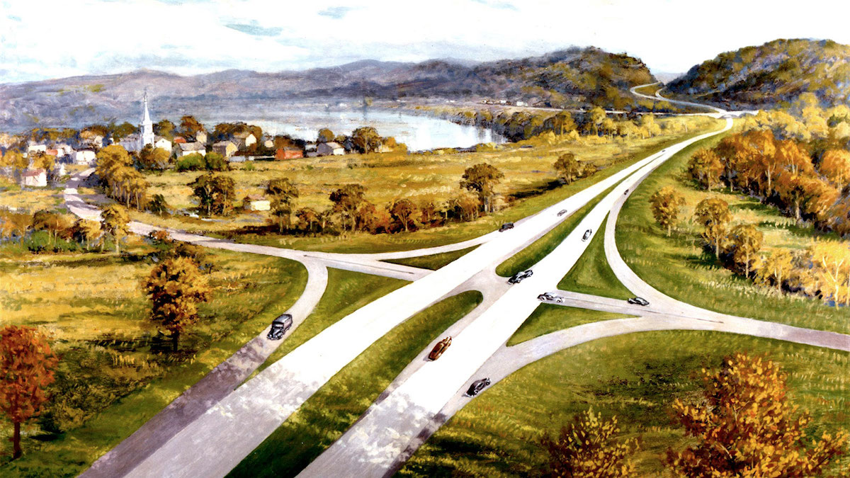 Different time, different technology… same technique: A 1950s visualisation of the proposed US Interstate highway system.