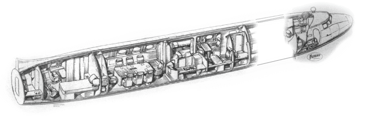 Forward of the conference room, two two-passenger cubicles were arranged along the port side with a galley and another passenger cubicle on the starboard side. Forward of those there was a washroom on either side of the plane, complete with hot and cold running water, lit mirrors and electric razors.