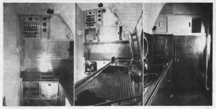Three views of the galley furnished by General Electric. The switch panel at top left is the call system from the various passenger compartments. (Flight)