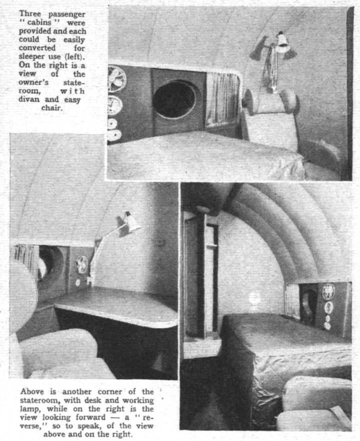 Three views of The Owner’s elegant, if compact, stateroom in the aft section of the C-54. The bulkheads and ceiling are all lined with pale tan leather. (Flight)