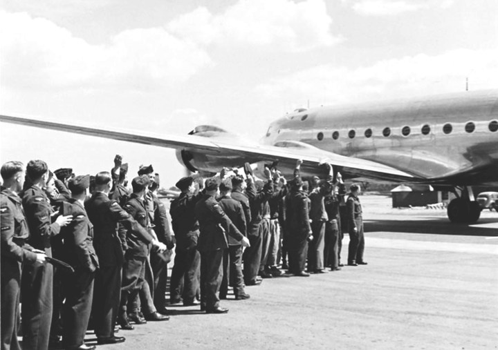 RAF airmen cheer as EW999 taxies out from Northolt – this time carrying Clement Attlee to Potsdam on July 28th, 1945. (© IWM 15771)