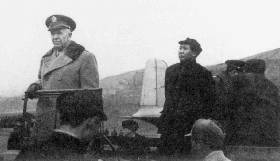 George C Marshall and Mao Tse Tung at Yan’an, China in November 1946. Note Marshall’s C-54 in the background – tail number 49049. (wikipedia)