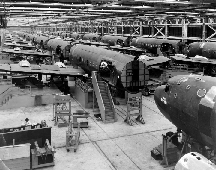 Inside Douglas Chicago. The 2 million square foot building was built of wood, to save steel, and was a true marvel of US wartime productivity.
