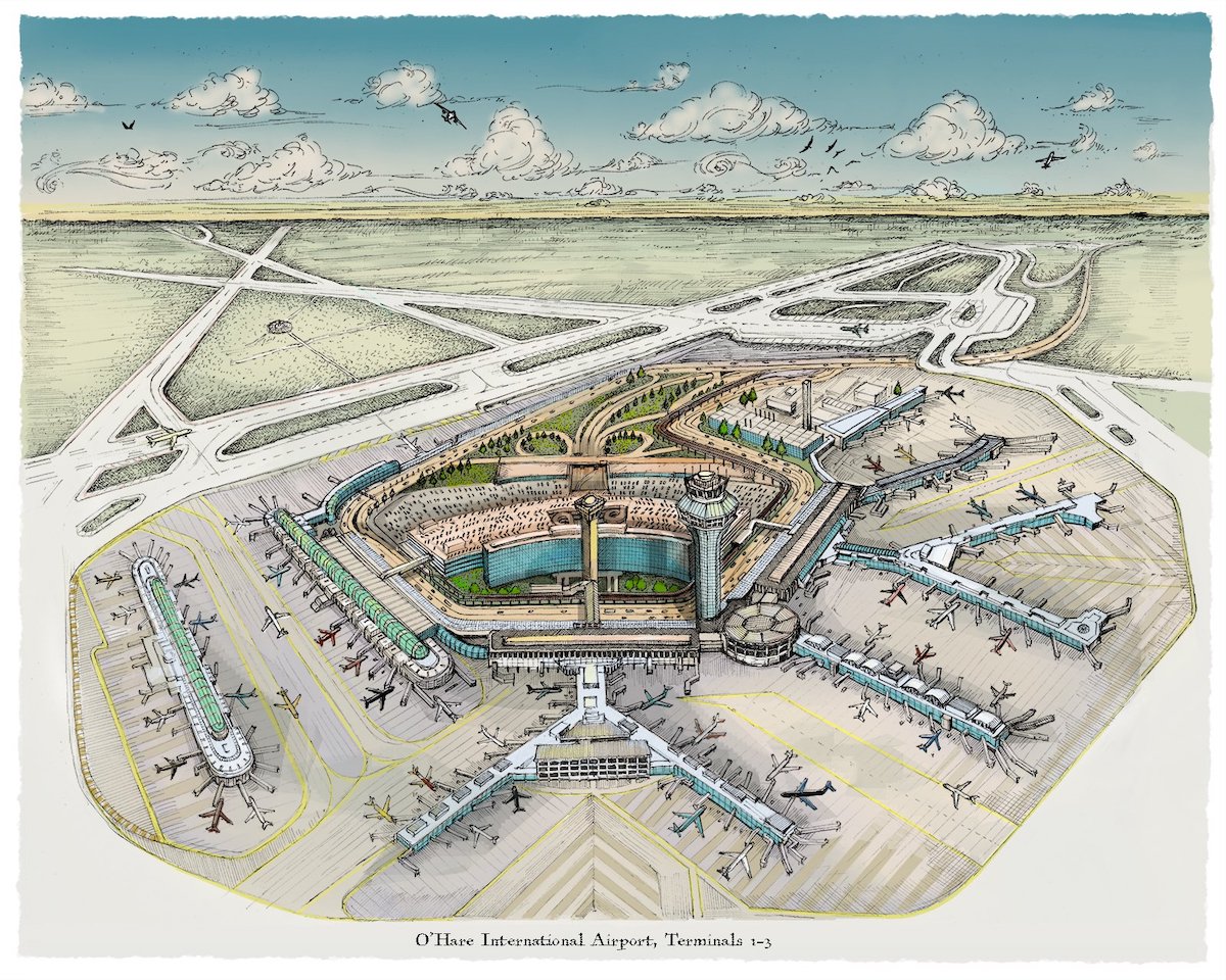 Recently, Phil turned his attention to that other mighty Chicago landmark – O’Hare. It was inevitable really. Although it towers sideways rather than upwards, the airport is a giant feature of the city’s human and economic pulse.